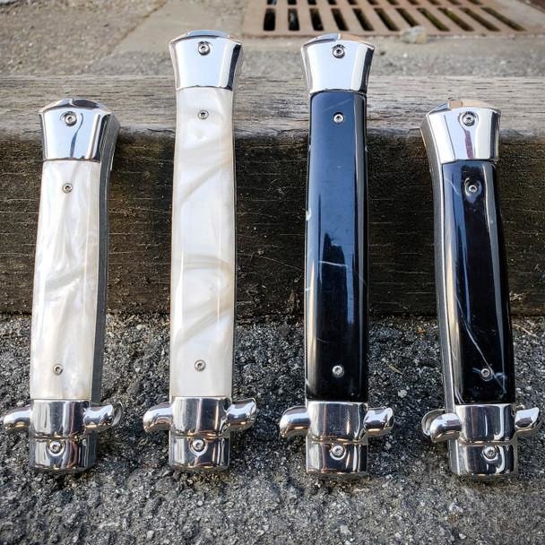 Sin duda, la navaja automática OTF Marbled Stiletto causará sensación, con una longitud total de 23 cm o 28 cm. Esta navaja cuenta con una hoja de acero inoxidable de 9,5 cm con pulido espejo, un filo extremadamente afilado y una punta penetrante. La hoja se despliega al presionar el gatillo deslizante y se retrae al jalarlo. Esta navaja de bolsillo cerrada de 10 cm o 12,7 cm presenta cachas clásicas en el mango y el gatillo deslizante se encuentra convenientemente ubicado en la parte superior. La impresionante navaja de bolsillo Stiletto se puede llevar de forma segura en una funda de nailon para cinturón con hebilla de liberación rápida.