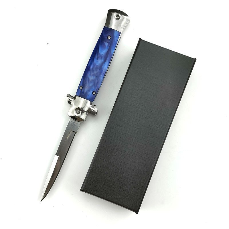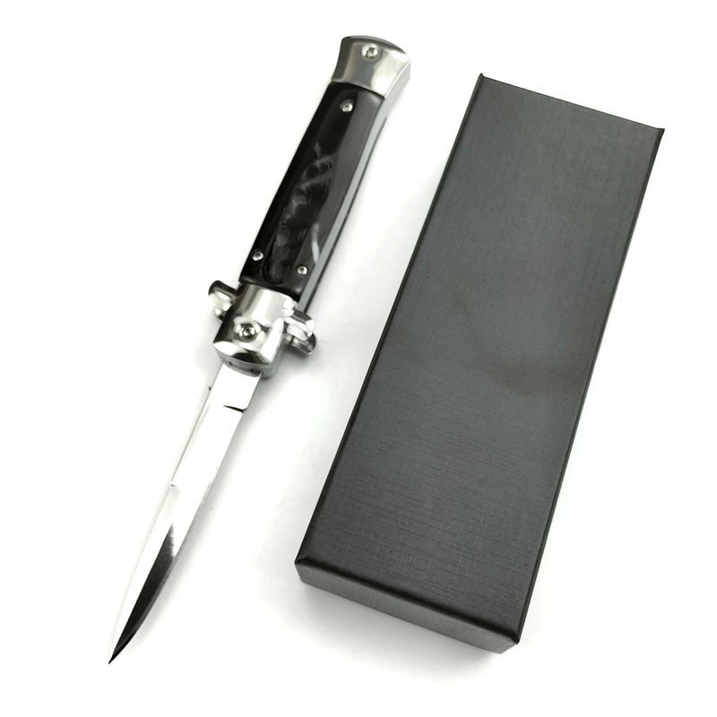 Navaja de estilete con botón pulsador Limo WreckNavaja automática Limo Wreck con botón pulsador. Esta elegante navaja automática es probablemente lo primero que te viene a la mente cuando piensas en una navaja clásica. Siéntete imponente y con control con esta hermosa hoja extralarga tipo bayoneta forjada en acero inoxidable, sin riesgo de oxidación. Un revestimiento anodizado negro le da un aspecto aún más elegante. El mango reforzado tiene un marco de latón con pasadores de latón, un botón de disparo plateado y un mecanismo de bloqueo de seguridad para evitar que la navaja se abra accidentalmente en el bolsillo. Los soportes del mango son de ABS con un acabado blanco perlado. La virola y el pomo también tienen un acabado negro anodizado para una apariencia elegante. Incluye una funda de nailon negra GRATIS con presilla para cinturón.
