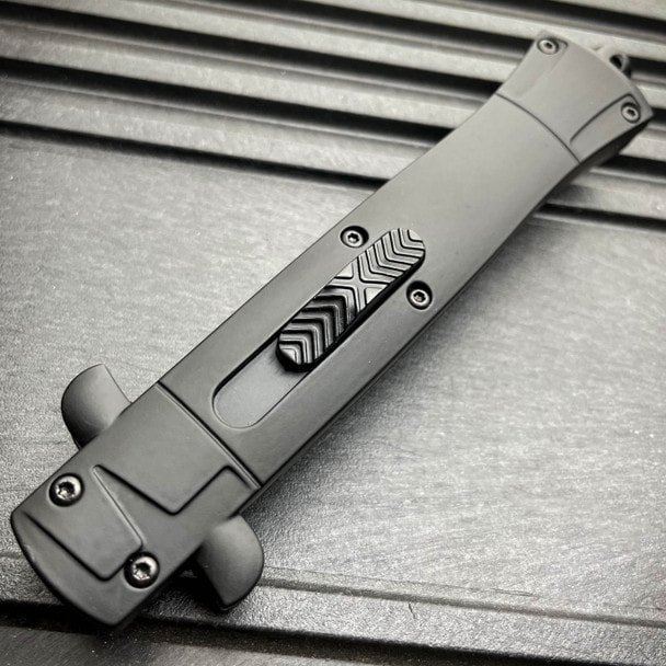 Esta navaja automática estilo italiano modelo OTF de 23 cm cuenta con una hoja de bayoneta grabada de un solo filo y un mango de aluminio con revestimiento de goma.