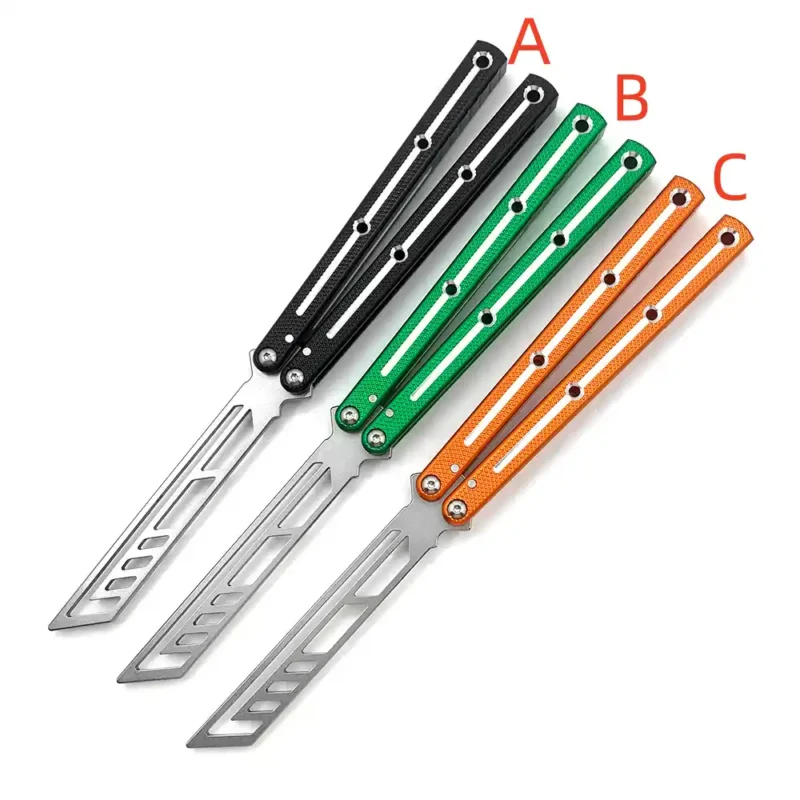 Total length: 255mm (10 inches) Blade length: 110mm (4.33 inches) Handle: 145mm (5.70 inches) Blade thickness: 3mm (0.118 inches) Blade width: 26.8mm (1.05 inches) Handle thickness: 12.6mm (0.49 inches) Hardness: 56-58HRC Blade material: 440 Handle material: Integrated aviation aluminum 6061-T6 System: Shaft sleeve Net weight: 109gREP integrado mango de aluminio sin cortar la práctica de la mariposa de formación